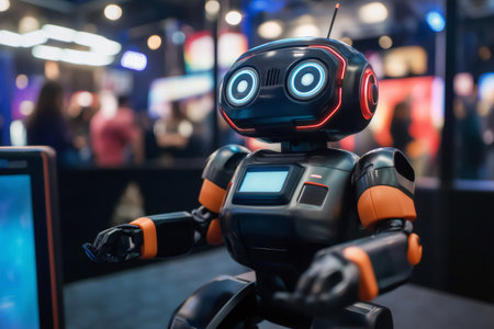 Advanced robot providing real time assistance and in game tips to players during a gaming expo, showcasing the future of interactive gaming experiences