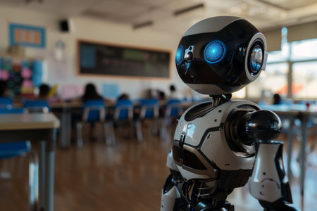 A robot is standing in front of a group of people in a classroom. The robot is wearing a helmet and has a black and silver body