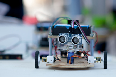 Group of diverse children kids with robotic vehicle model, close-up view on hands, science and engineering lesson in a classroom, making, coding and programming a robot in a school, robotics projects