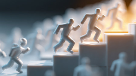 Abstract paper human figure ascending steps to a trophy, symbolizing perseverance, success, and business goals