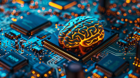 This striking depiction showcases a digital brain illuminated by vibrant orange lights, resting on complex circuitry. It captures the essence of artificial intelligence and technological innovation.