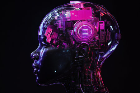 A clear, artificial head displays intricate circuits and glowing components inside. The detailed design highlights technology and innovation in a futuristic style.