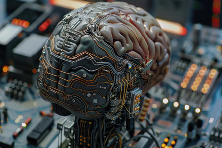 Futuristic artificial intelligence brain connected with a motherboard in a laboratory, symbolizing advanced technology