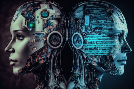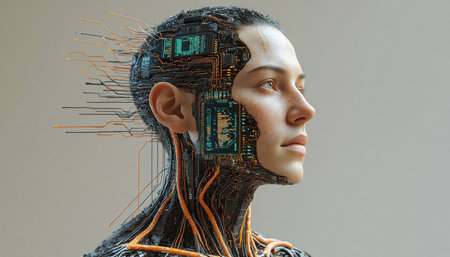 A stunningly portrayal merges a human head with an AI machine, showing intricate cybernetic details.