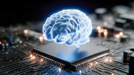 A brain model symbolizes AI technology on a circuit board, blending digital innovation and cuttingedge computing
