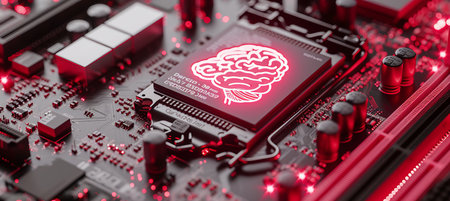 Detailed view of a glowing red AI processor on a complex blue circuit board, representing artificial intelligence and advanced technology.