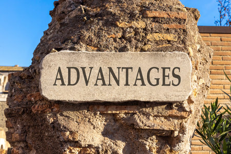 Advantages symbol. Concept word Advantages on beautiful white marble sign plate. Beautiful ancient brick wall background. Business advantages concept. Copy space.