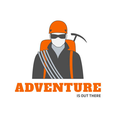 Vector logo or badge template of man climber in sun glasses with equipment for mountaineering. Perfect for extreme sport and travel adventures.