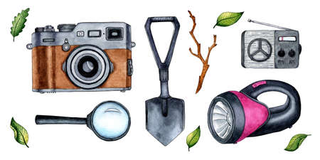 Set of watercolor illustrations expedition camera, shovel, magnifier, radio, flashlight. Camping excavations. For the design of design compositions on the theme of tourism, hiking, outdoor recreation. isolated on white