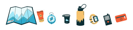Necessary equipment for hiking flat color vector objects set. Touristic inventory with map and devices illustrations bundle on white background