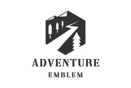 Vintage Retro Hexagonal Mountain Pine Forest River Creek or Winding Street Road Badge Emblem for Outdoor Adventure Logo Design