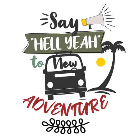 Vector card with hand drawn unique typography design element and mountains for greeting cards and posters. Say yes to new adventures in vintage style