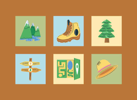 Set Forest Climber rope Location mountains Marshmallow stick Hiking backpack Wooden ax Life jacket and Compass icon. Vector.