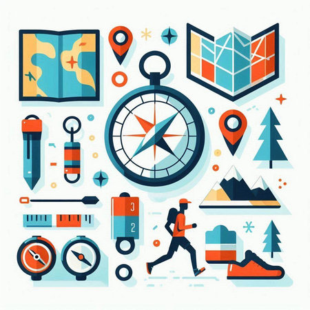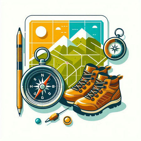 Compass, boots, compass, map and other equipment. Vector illustration.