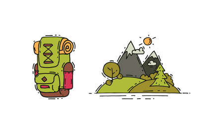 Camping and Expedition Equipment with Backpack and Nature View Vector Set