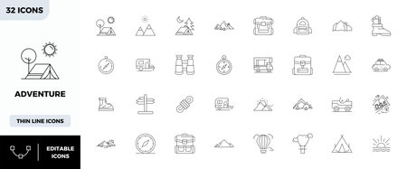 Comprehensive toolkit of 32 vector icons themed around Adventure, developed in Minimal Line with 128x128 PIXEL perfect precision for versatile design applications.