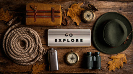 Plan your adventure concept - Adventure written on a small sign, compass and binocular outdoors, wooden background