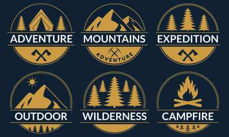 Adventure logo or badge set with mountains and forest. Outdoor expedition emblem. Camp with camfire label. Vector illustration.