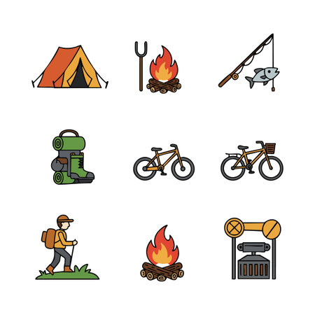 This vector set features camping gear, bicycles, campfires, and hiking elements in a simple colorful style, evoking outdoor adventure and leisure vibes.