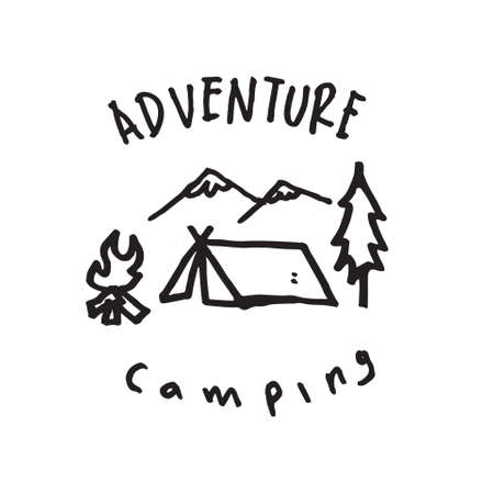 Linear logo with inscription and camp tent in mountains