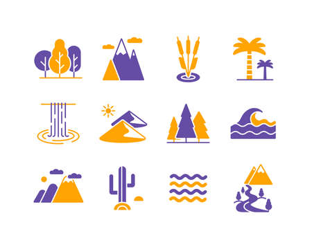 Vector nature glyph icons set. desert, mountains, forest, river, sea, lake. Graph symbol for travel and tourism web site and apps design, logo, app, UI