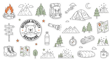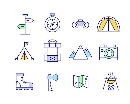 Set of line art funny colorful doodle travel camping trekking icons. Tent, backpack hiking boots, map axe bonfire