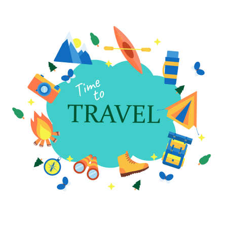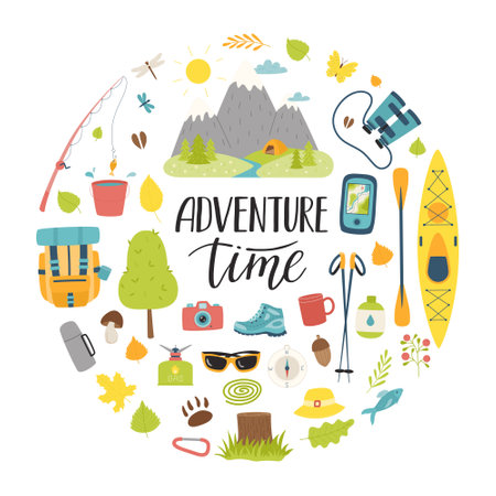 A set of tourist equipment for camping, traveling, picnic, fishing. Lettering adventure time. Round composition as a print on clothes, postcards, web. Flat vector illustrations isolated on white.