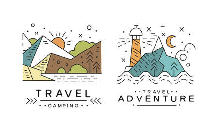 Travel Original Design Set, Adventures and Camping Badges or Labels Cartoon Vector Illustration
