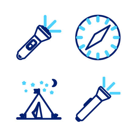 Set line Flashlight, Tourist tent with flag, Compass and icon. Vector