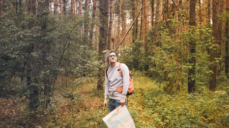 Traveling man with dreadlocks with map in woods. Male traveler with backpack in woods reading map in cloudy weather.