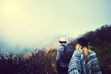 Brave woman guiding traveler into the fog in the mountains. Follow me. Woman holding man by hand and going in mountains.