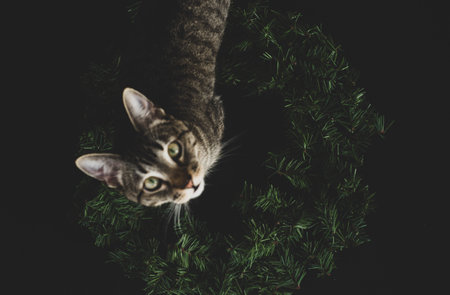 Empty Christmas wreath on a black background, with a blurry cat on top