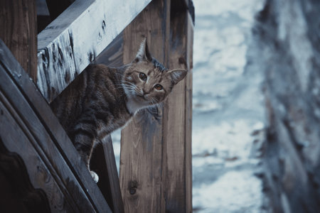 Street cat looking at the camera among the wooden pier