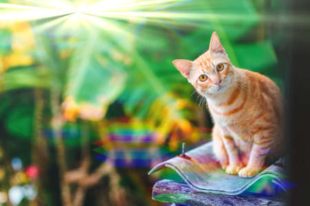 Ginger cat in sunshine looks at camera. Warm colorful animal photography. Stray friendly cat on roof