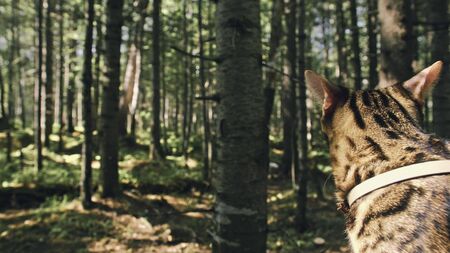 One cat in a city park. Bengal wildcat walk on the forest in collar. Asian Jungle Cat or Swamp or Reed. Domesticated leopard cat hiding, hunting and playing in grass. Domestic cat in outdoor nature.