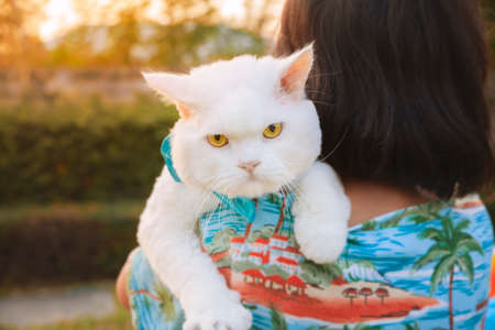 An Asian woman carries a white Persian cat on the lawn in the evening. A Persian cat that has been trimmed short for cleanliness and gentleness of the skin. looking at the camera with orange eyes
