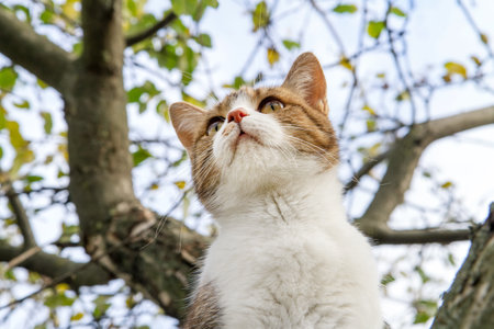 Close-up portrait of a cat on a tree. Cat view from below
