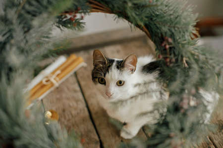 Cute little cat looking at rustic christmas wreath with pine branches and red berries on old wooden background. Adorable funny cat helps making rustic xmas wreath. Winter holidays in countryside