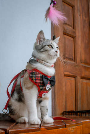 Beautiful cat playing on a wooden timber in the garden Thailand.
