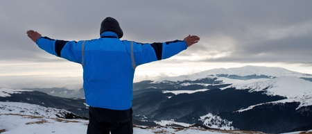 Portrait of a winter-dressed man in full growth on top of snowy mountains