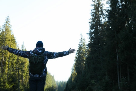 Backpacker man looks at sunrise in a pine forest. Back view. Copy space. Toned