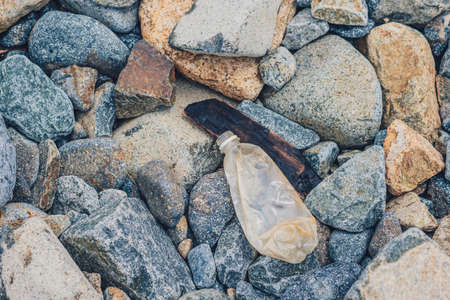 Plastic garbage on the seashore. Top view of a polluted beach. Stones and shells mixed with plastic. Environment concept