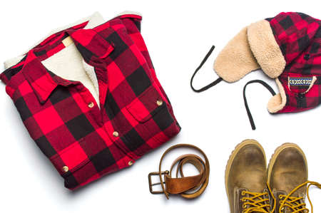 Set-a set of accessories and fashionable stylish clothes.Sweater ,shoes,earrings, colored jars,twigs with red berries, powder brush, and braided thin belt on a white background.