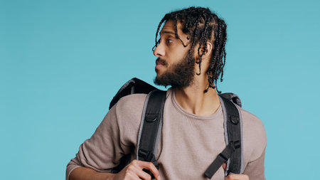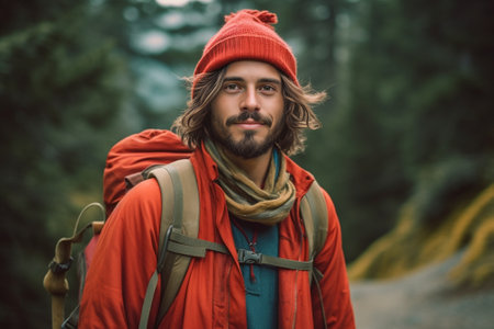 Serious young male hiker has trip in woods uses trekking sticks enjoys travel lifestyle wears binoculars on neck wears casual hat and red jacket isolated on blue wall Act : Generative AI