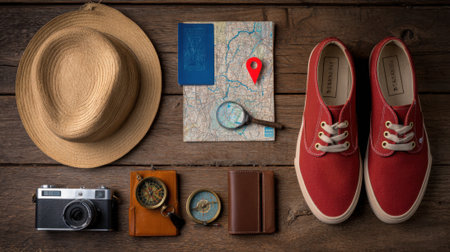 A collection of vintage travel items including a hat, camera, compass, map, and shoes arranged on a rustic wooden background.