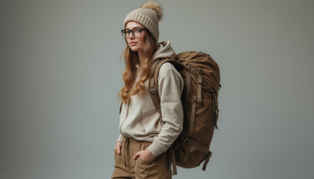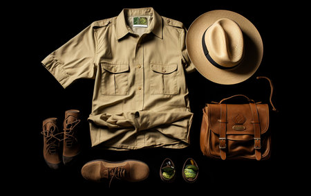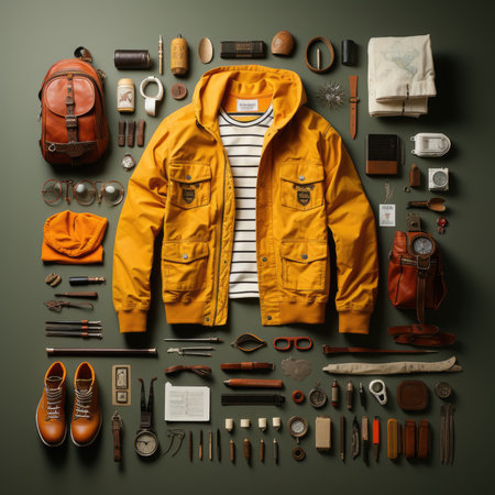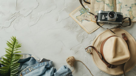 Artistic arrangement of a backpack, hat, camera, book, and map on a table. The visual arts composition includes patterns and textures, creating a unique and aesthetic display AIG50
