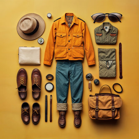 A stylish collection of men's casual outdoor clothing and accessories neatly arranged on a vibrant yellow background. The ensemble includes a complete outfit of teal trousers and an orange jacket, complemented by a straw hat, sunglasses, brown leather shoes, and a belt. Additional items include khaki trousers, a greyish-green shirt, two watches, a cream-colored wallet, and an open brown leather bag.
