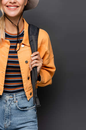 Portrait of Asian woman wearing white t-shirt and hat , holding camera and carrying backpack, smiling and looking at camera. Travelling concept.