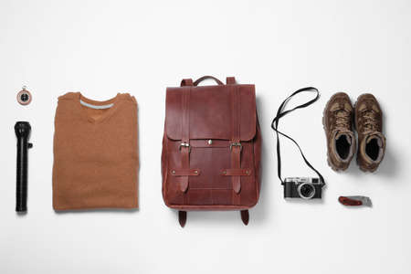 Composition with leather backpack and camping equipment for tourist on white background, flat lay