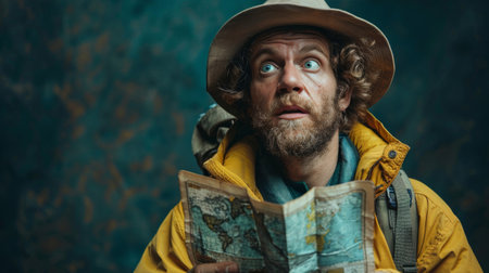 A man wearing a bright yellow jacket and hat is focused on studying a map for directions.